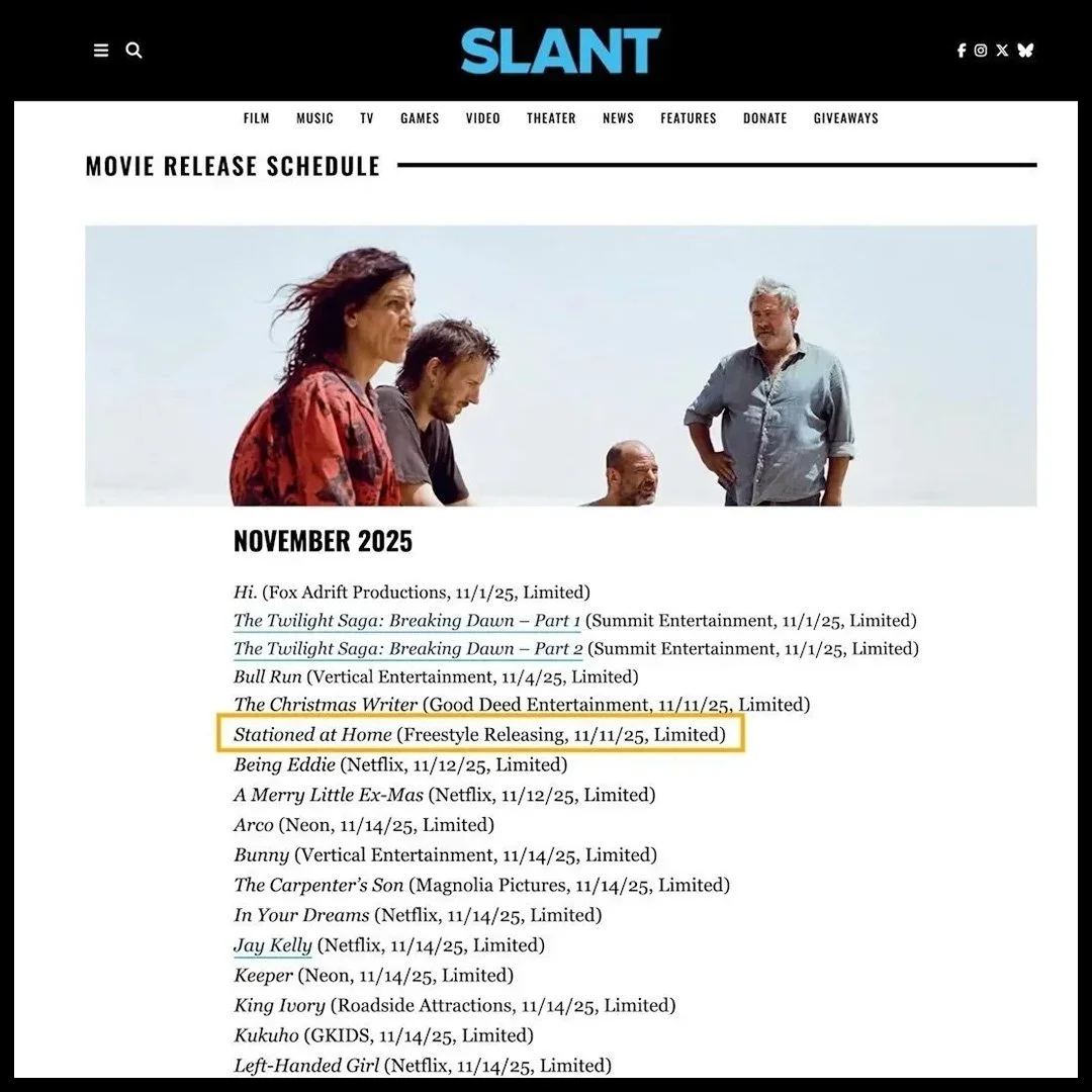 NOVEMBER 2025: Stationed at Home (Freestyle Releasing, 11/11/25, Limited) Covered soon before Stationed At Home’s North American release.